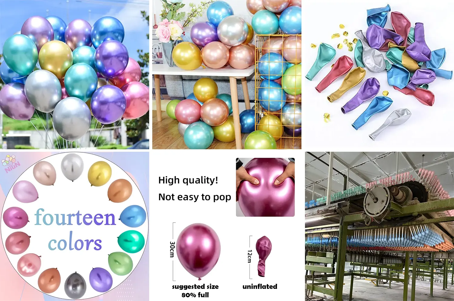 1. Látex natural superior, excelente desempenho: matérias-primas de látex natural de alta qualidade selecionadas do Sudeste Asiático, excelente elasticidade, ductilidade, inflação total não é fácil de estourar, o revestimento de metal é forte e duradouro, o brilho brilhante não cai.