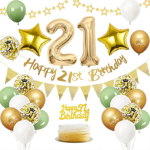 21º conjunto de balões:Este 21º conjunto de balões é composto por balões de látex, balões de alumínio, bandeiras de aniversário e outros acessórios. É fácil de montar e pode deixar sua festa de 21 anos mais cerimonial. Um cenário deslumbrante e de alta qualidade irá ajudá-lo a alegrar a noite do seu aniversário de 21 anos e fazer deste um momento precioso que sua filha, você e toda a família nunca esquecerão.