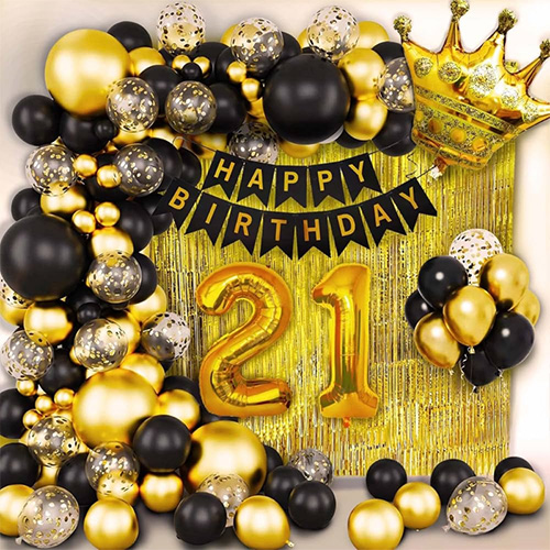 21º conjunto de arco de guirlanda de balão:Este conjunto de arco de guirlanda de 21º balão as cores principais são preto, ouro, prata, etc., que é muito indicado para decoração masculina e feminina na festa de aniversário de 21º. Eles podem ser pendurados na porta ou na parede e também são muito adequados para uso interno e externo para criar uma festa de aniversário de 21 anos exclusiva para homens ou mulheres.