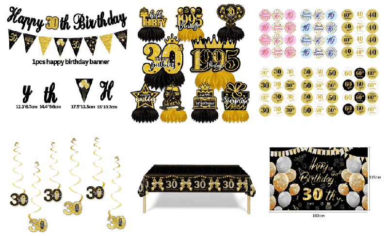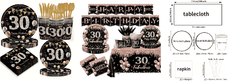O cartão de aniversário de papel é o núcleo da decoração do bolo: o cartão principal é baseado em palavras como "Feliz 30º ANIVERSÁRIO" e combina com o formato de uma taça de champanhe. O tamanho é grande e adequado para decorar o bolo principal. Há também logotipo circular “30”, estrelas, coroas e outros pequenos cartões, próprios para cupcakes, feitos de papelão rígido grosso, com palitos de bambu na parte inferior, que podem ser inseridos para uso.