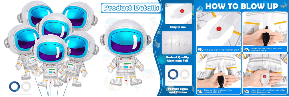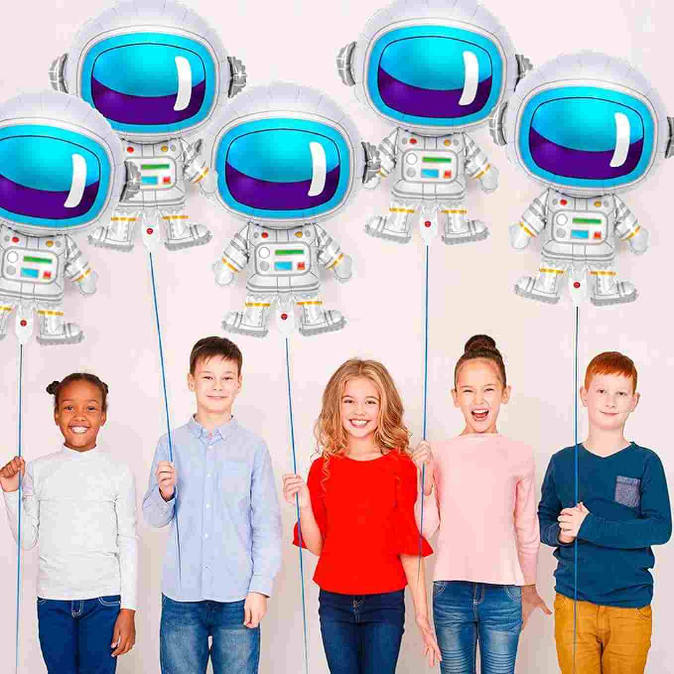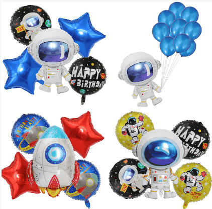 Existem astronautas comuns em formato de corpo inteiro, mostrando a imagem de astronautas vestindo um traje espacial, alguns estilos com base, inflável pode ficar de pé. Existem vários tamanhos, como 18 polegadas, 24 polegadas, 28 polegadas, etc., bem como alguns balões maiores, como balões de alumínio de astronauta em pé com altura de 65 cm. É usado principalmente para festas de aniversário com tema espacial, festas de boas-vindas para bebês, decoração de quartos infantis e outras ocasiões, que podem adicionar um ambiente alegre ao evento.