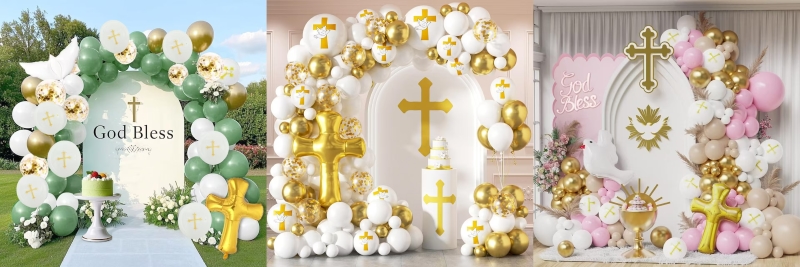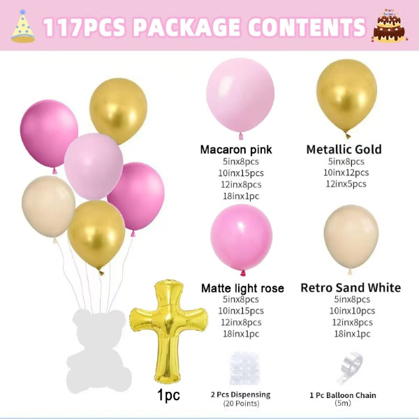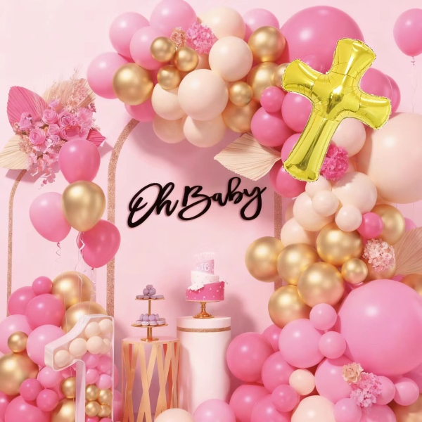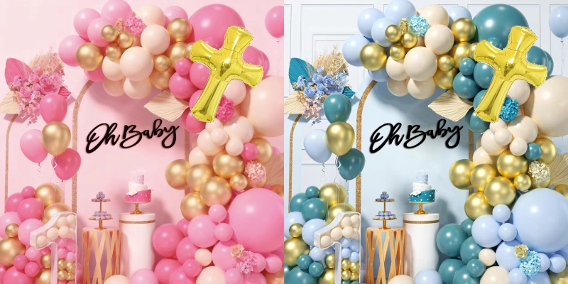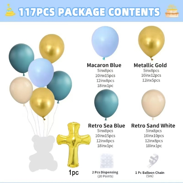 Os kits de arco de balão para chá de bebê têm dois estilos, um estilo é para meninas e um estilo é para meninos. O conjunto para bebês é feito de balão rosa macaron, balão rosa claro fosco, balão cor de pele clara fosca, balão dourado metálico e uma cruz dourada que Deus abençoe. O conjunto para bebê menino é feito de balão de cor azul macaron, balão de cor azul mar retrô, balão de cor de pele clara fosca, balão de cor dourada metálica e uma cruz dourada que Deus abençoe. Ambos têm ponto de cola e viagem de balão, você pode usá-los para fazer uma linda guirlanda.