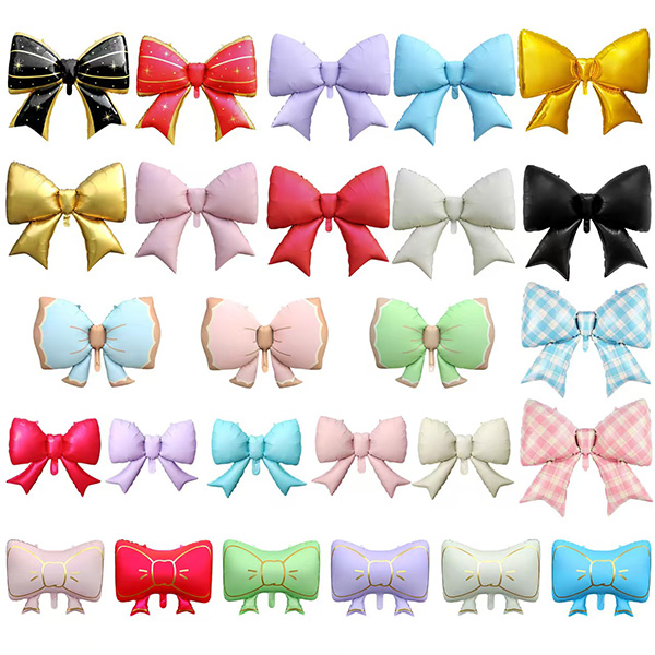 Esses balões de papel alumínio mudam o visual clássico de laço. Alguns têm pontas de fita com uma curva ou uma divisão. Alguns mostram um design oco. O estilo parece fresco e especial. Eles trazem um sentimento de arte. Eles se tornam o destaque em qualquer configuração do partido.