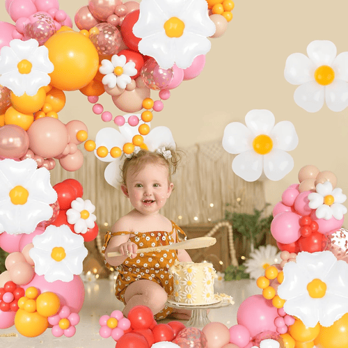 Use balão de látex colorido e decorações de aniversário (banner de aniversário, modelo de bolo) para decorar sua festa de aniversário. O balão margarida é muito atraente dentro deste kit.