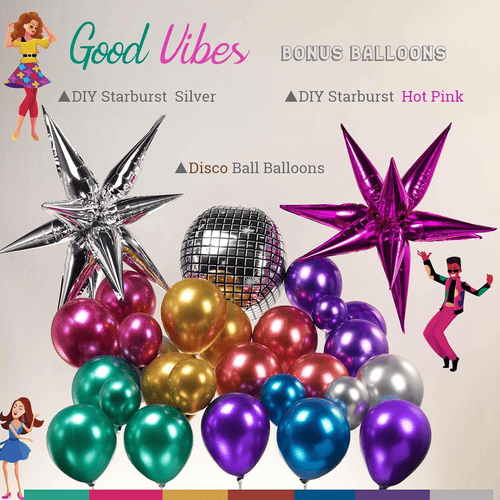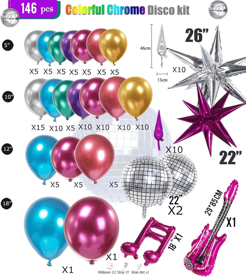 Okit de arco de balão de discotecaconsiste principalmente embalões de látex coloridos evários balões foil. Para fazer o estilo cromado brilhante, os balões de látex que fornecemos são balões de látex metálico, suas superfícies têm um brilho metálico muito bonito, podendo alcançar excelentes resultados tanto em ambientes internos quanto externos. Os tamanhos deles são 5 polegadas, 10 polegadas, 12 polegadas e 18 polegadas.