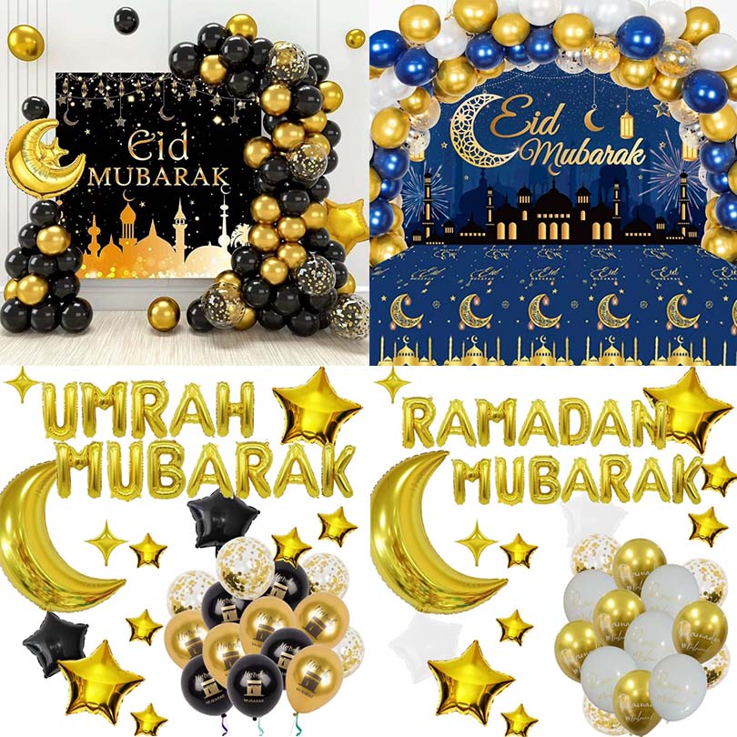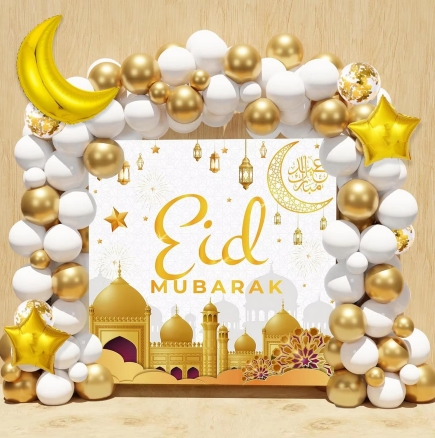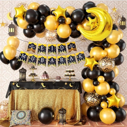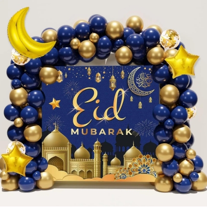 Niun® brand Eid al-Fitr balloon garland kits usually contain a variety of items, such as Eid-themed latex balloons and foil balloons of various sizes and colors, backdrop, tablecloths, fishing lines, balloon chains, glue spots, manual or electric air pumps, etc. The Eid al-Fitr balloon garland customization can be according to customers' preferences and needs for Eid al-Fitr decoration to meet the different needs de consumidores.