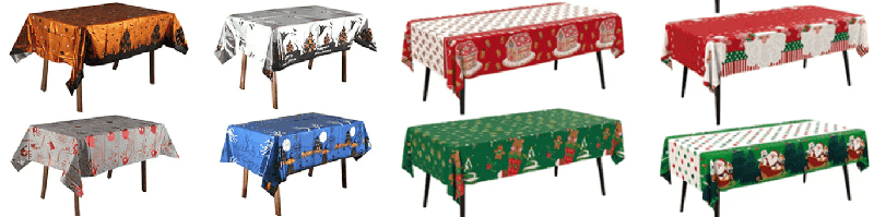 Por exemplo, a combinação de cores vermelha e verde do tema de Natal, a toalha de mesa de papel alumínio com padrão de árvore de Natal e floco de neve, a combinação de cores preta e laranja do tema de Halloween com padrão de abóbora e morcego, e a combinação de cores vermelha e dourada do tema do Festival da Primavera com personagens de sorte e padrão de lanterna podem ser usadas para decoração de férias em casas, shopping centers, bares, restaurantes e outros lugares.