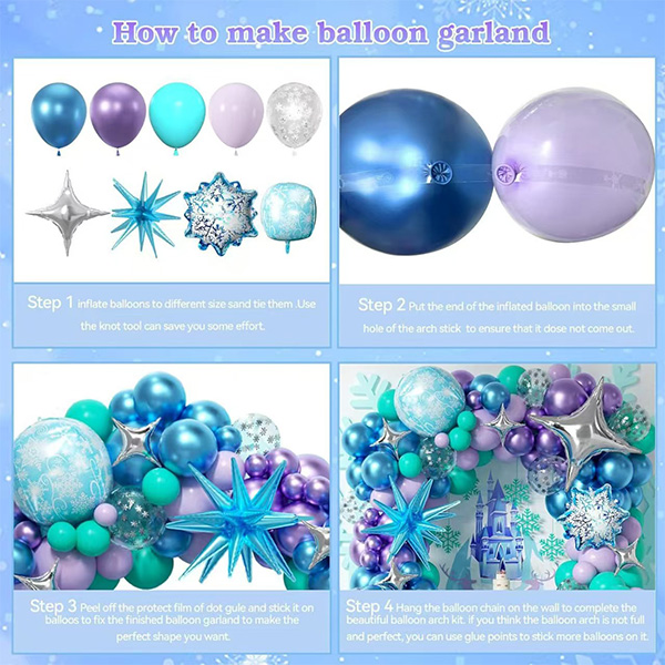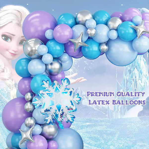 Além dos balões regulares, o kit inclui muitos elementos em forma de tema. Existem grandes balões de floco de neve. Eles têm texturas delicadas. Eles são como os flocos mágicos de neve criados por Elsa no filme. Você pode usá -los para construir um arco. Você também pode usá -los para decorar uma parede de fundo. Essas cores se misturam. Eles instantaneamente criam uma atmosfera como estar em um reino de gelo e neve.