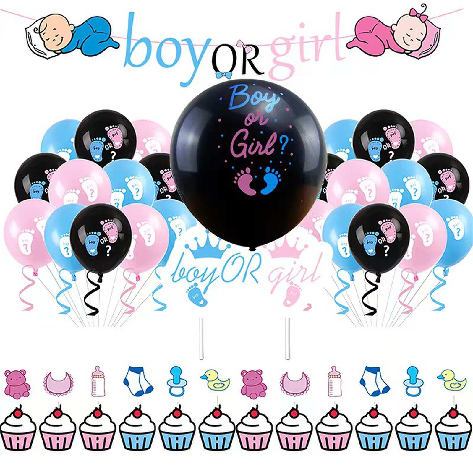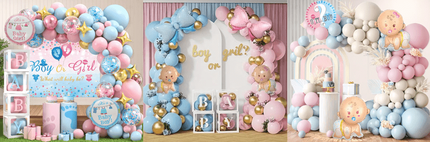 Também fornecemos balões de látex impressos de 12 polegadas, em sua maioria desenhados em azul e rosa, que podem ser combinados em buquês de balões, decorações de parede ou pequenas correntes de balões para transformar a sala e o quarto em espaços exclusivos para divulgação de gênero e deixar a sensação de ritual penetrar em cada detalhe.