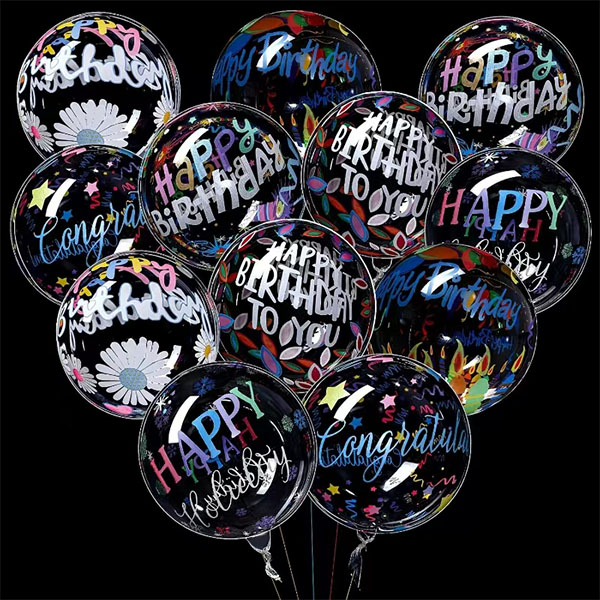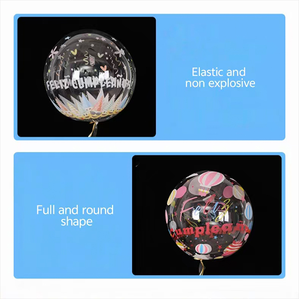 O Bobo Bobo, impresso, Bobo Balloon tem as palavras "feliz aniversário" e alguns designs impressos na superfície do balão. A impressão é clara e brilhante. A cor não desaparece. A principal característica do design é uma forma de peça. As palavras e os desenhos fazem parte do balão. O visual é mais bom e mais profissional. O tipo impresso vem com muitas cores e muitos padrões. São estrelas, coroas, notas e outras formas. Eles mostram profundidade e camadas na superfície clara do balão. O balão parece mais sofisticado e mais elegante. É bom para uma boa decoração de festa.