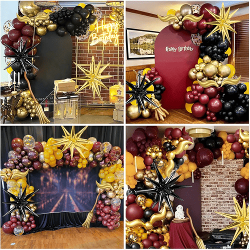 O balão de látex no arco de balão com o tema Harry Potter é feito de látex 100% cru, importado do Sudeste Asiático. Por serem materiais naturais, são totalmente ecológicos e inofensivos para crianças e adultos. Suas cores são simbólicas dos filmes de Harry Potter, incluindo vinho tinto, amarelo, preto e dourado. Para adicionar mais camadas, adicionamos também o balão de confete, o confete é dourado metálico.