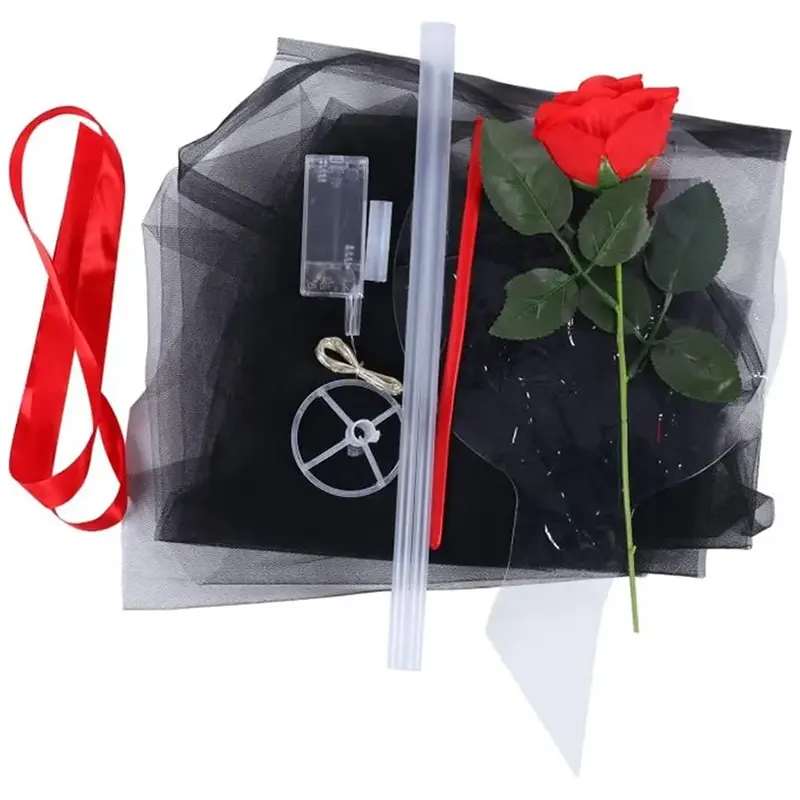 | Acessórios | Tiras de luz LED, papel de buquê, restos de papel de lantejoulas, flores de rosa artificiais |