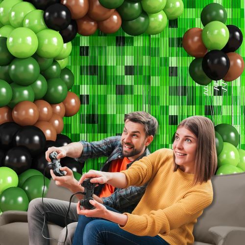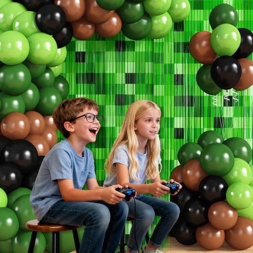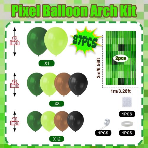 Este kit de arco de balão minecraft de aniversário é coberto por verde escuro fosco, verde maçã fosco, preto fosco e marrom fosco. Tem balão de 10 polegadas, balão de 12 polegadas e balão de 18 polegadas.