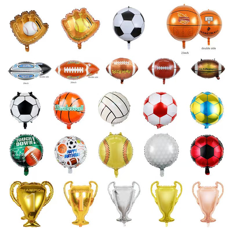 Traje de balão com tema esportivo com competição dinâmica, luta de sangue como conceito central de design, com cores vivas, padrões dinâmicos para transmitir paixão esportiva, para que as atividades sejam repletas de atmosfera animada. Basquete, futebol, tênis e outros temas esportivos individuais ou cenas abrangentes de festas esportivas podem ser decorados com balões para criar uma experiência envolvente. De acordo com as características do material e cenários de uso, é dividido em duas categorias: balões de látex com temática esportiva e balões foil, que são adequados para diferentes atividades de escala e requisitos de layout.