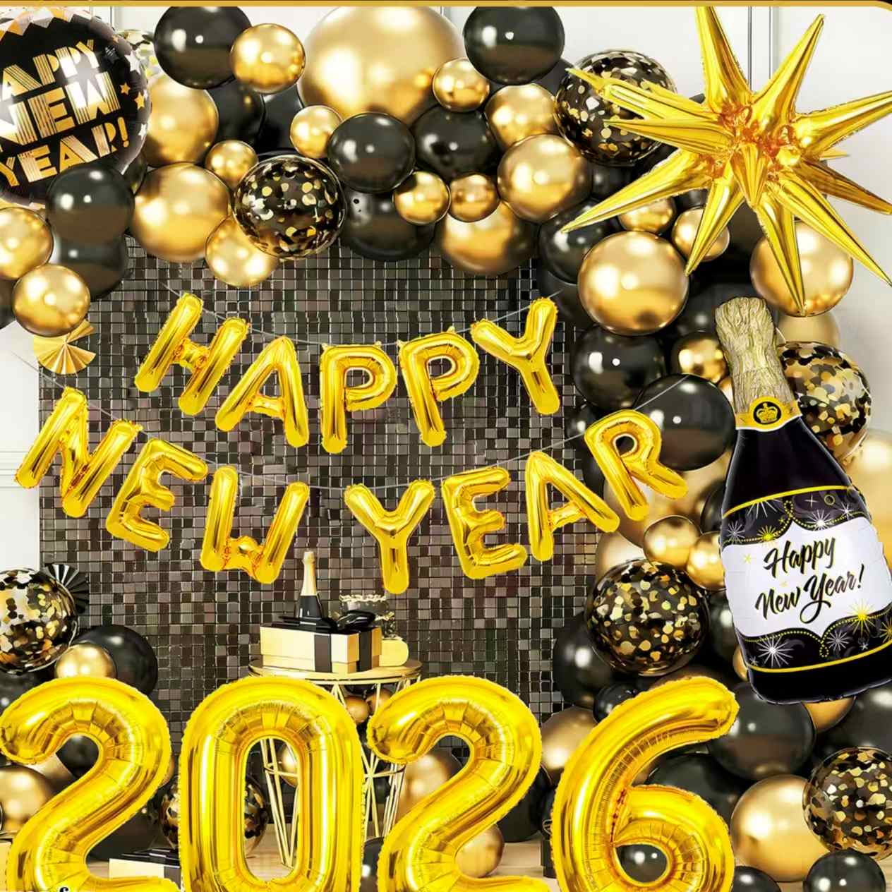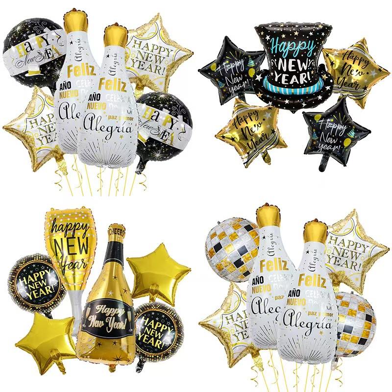 Pense no conjunto temático de Ano Novo. Tem balões de alumínio que parecem garrafas de champanhe. Também inclui balões com números "2026", balões decorativos com estrelas e muito mais. As cores principais são preto-ouro ou ouro-branco. Está cheio de alegria festiva de Ano Novo. Pode facilmente criar uma cena luxuosa e cerimonial de festa de Ano Novo.